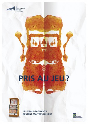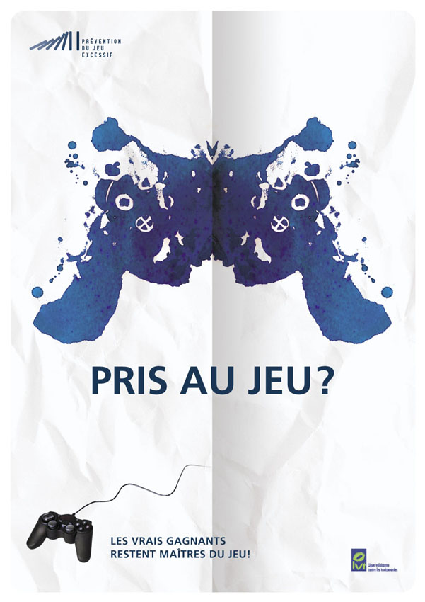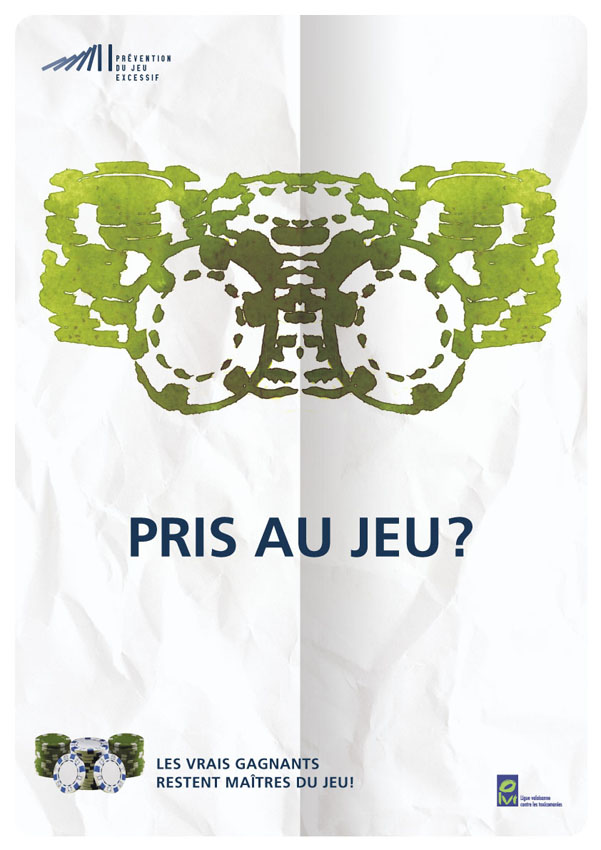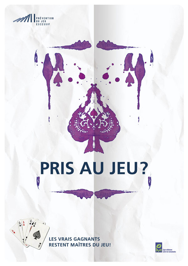 La machine à sous, les cartes, les jetons de casino, la manette de jeu vidéo sont représentés à la manière des fameuses taches de Rorschach pour signifier l’aspect obsessionnel de l’addiction au jeu.